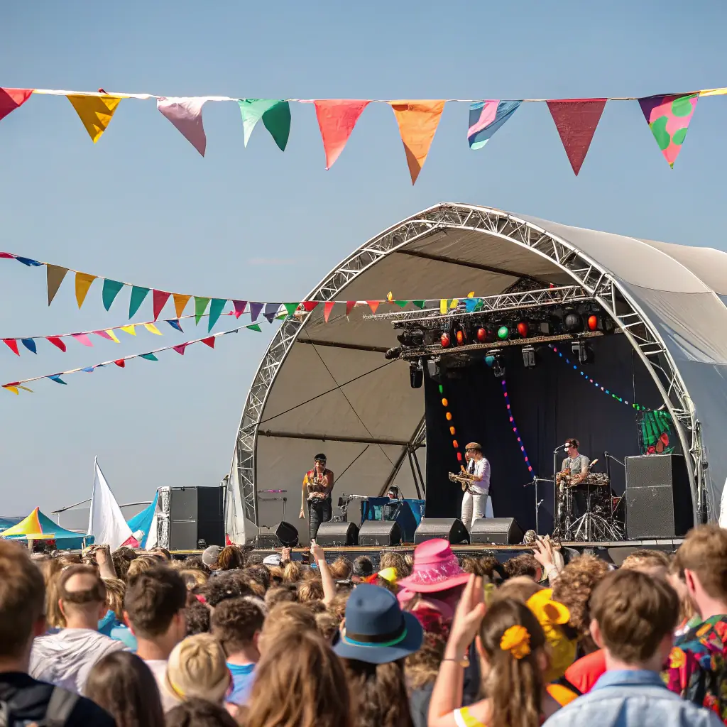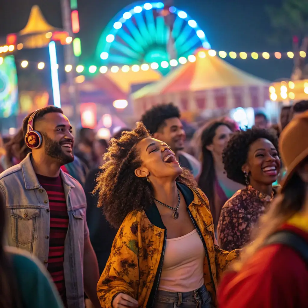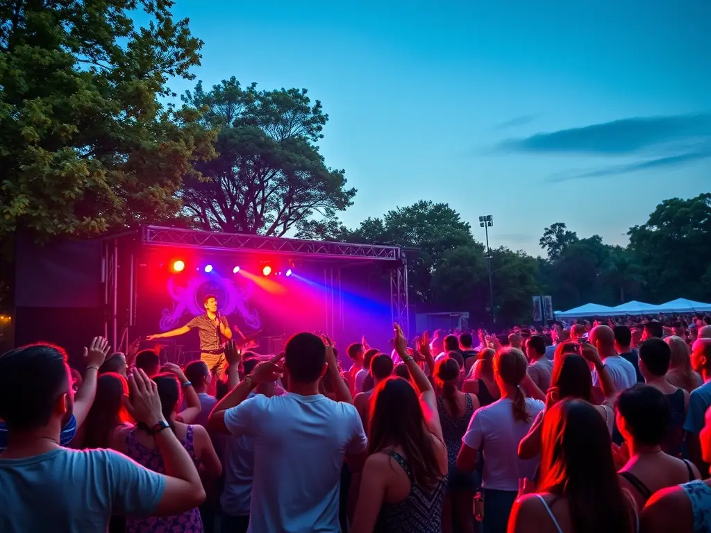 - Crowd enjoying a live outdoor concert with colorful stage lighting and artist performances.