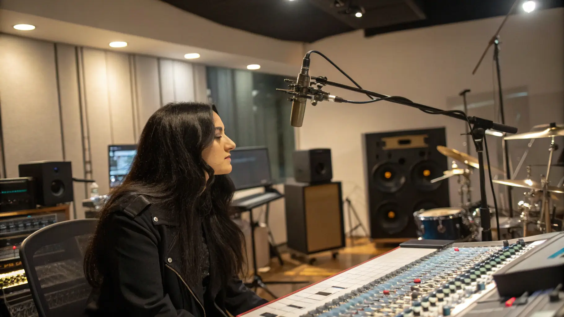 - Young musicians recording in a professional studio with mentors guiding them.